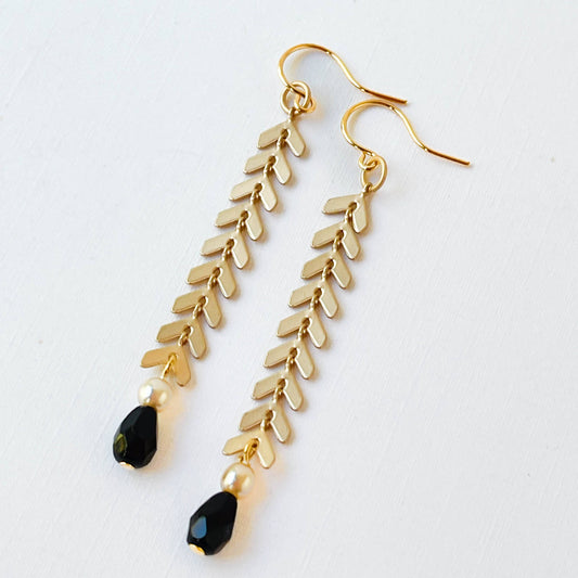 Long Gold Chevron Earrings with Pearl and Black Beads